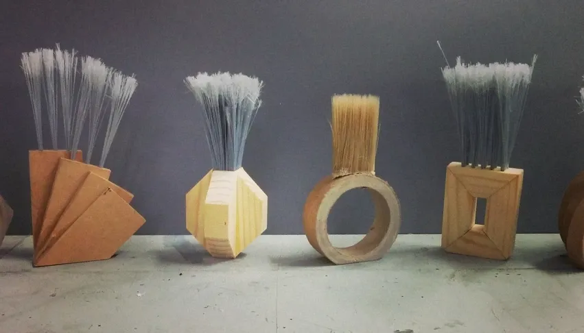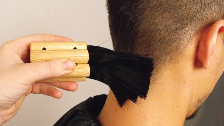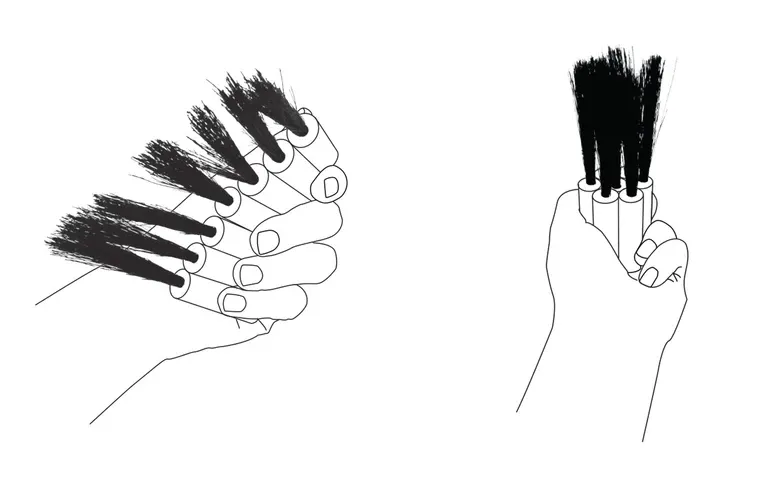 Hairdresser’s brush for two hand positions. The wide position allows the user to hold the brush widespread to be used on large surfaces. The centered position allows the user to focus on a small surface or a specific spot. Made of oak wood, optic fibers and rubber bands.